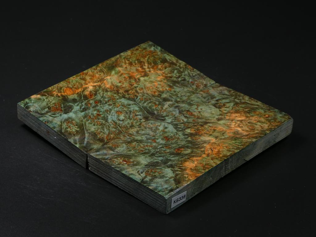 Two (book matched) stabilized burly big leaf maple knife scales. Green in color.