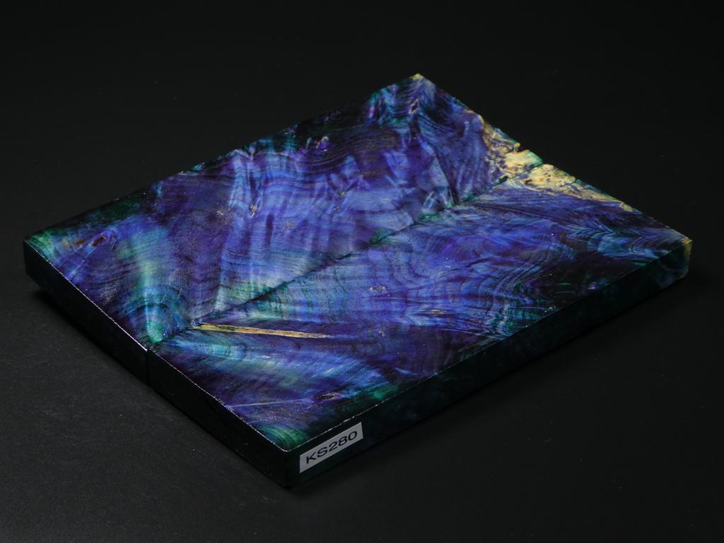 Two (book matched) stabilized burly big leaf maple knife scales. Purple, Blue, Teal in color.